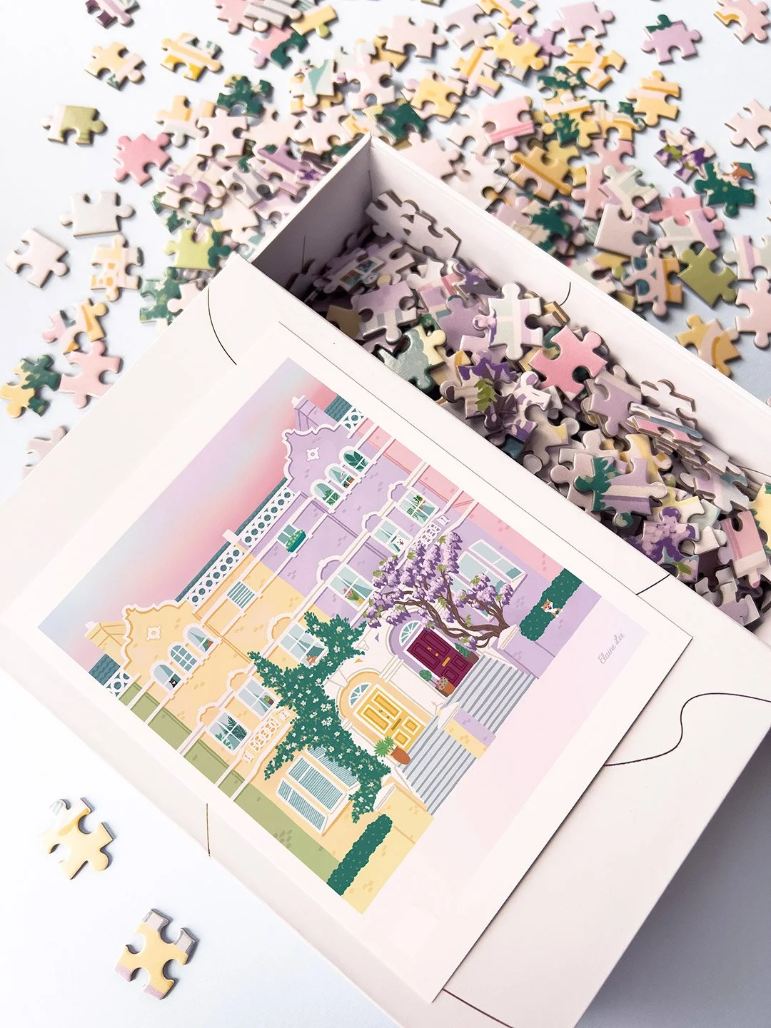 Colourful and detailed artwork designed to enchant and delight. From charming storefronts, to aspirational travel destinations, each illustration was created to with the joy of puzzling, and the meditative enjoyment of paint-by-number kits in mind.